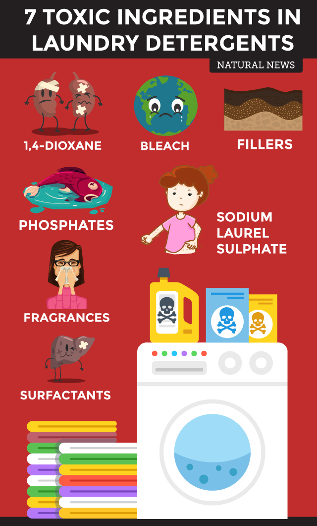 - Surfactants – These ingredients are also known as cleaning agents, and are included in laundry detergents to boost their cleaning capabilities. Besides their numerous detrimental health effects on people – which run the gamut from allergies to liver damage to compromised endocrine systems — surfactants can do a number on the environment as well. When surfactants come into contact with freshwater fish, they break down the protective coating that keeps parasites and bacteria at bay. A couple of known surfactants include linear alkyl benzene sulfonates (LAS) and nonylphenol ethoxylates (NPE).
